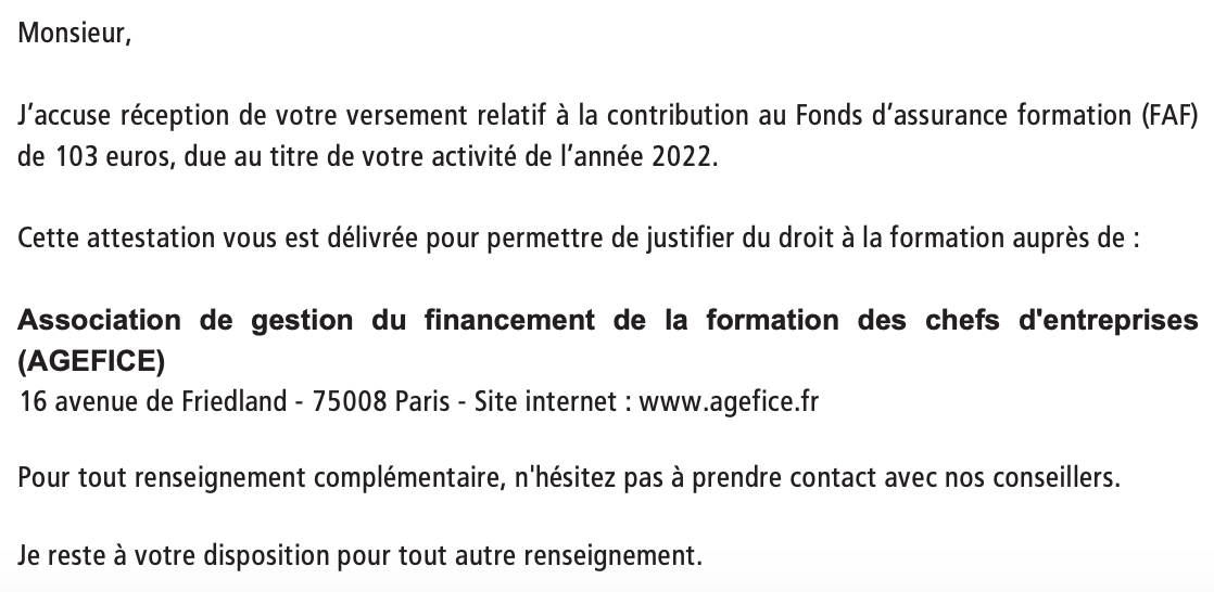 Sur l'attestation, figureront les informations utiles dans les démarches de co-financement / prise en charge de vos actions de formation.